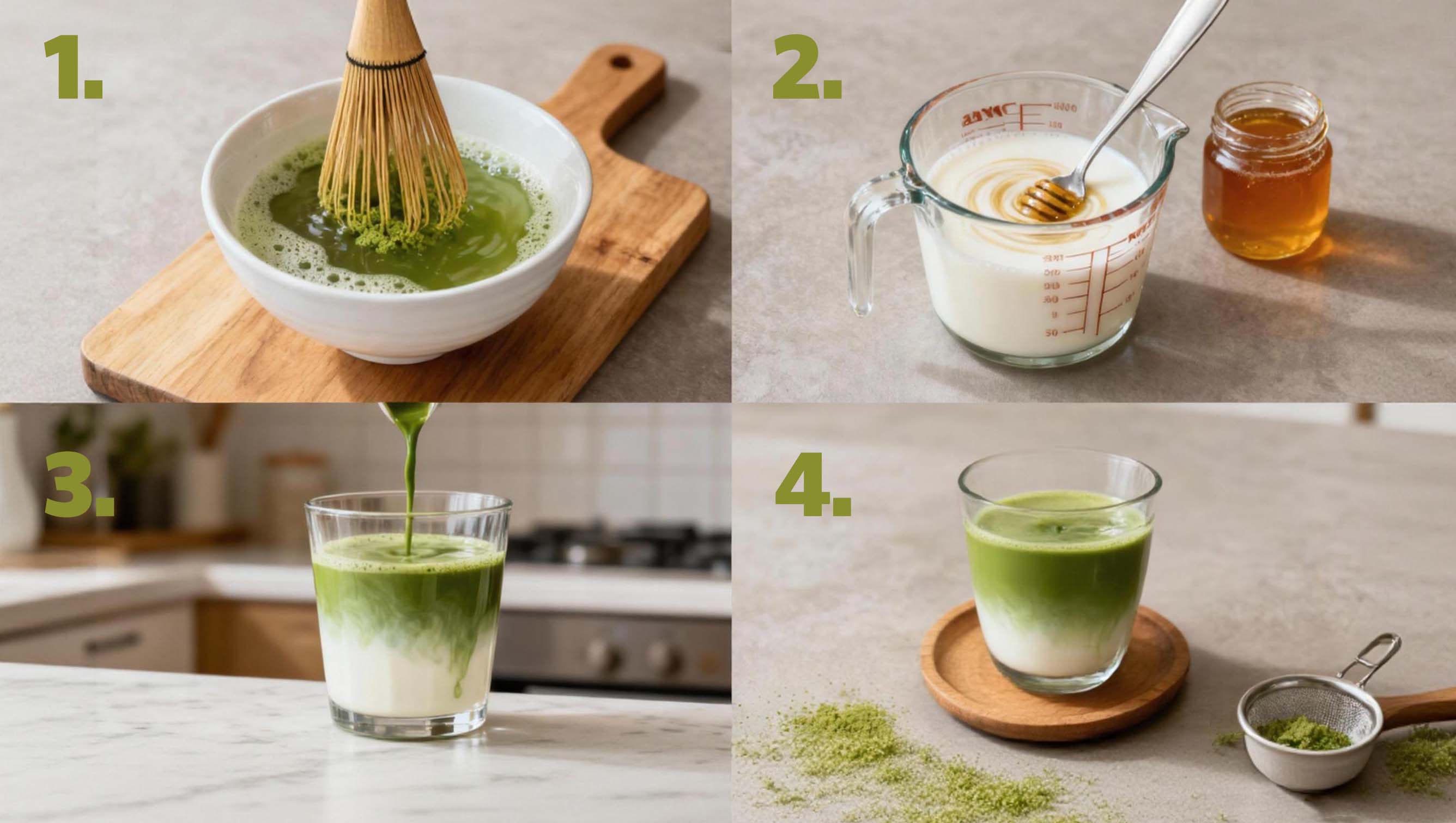 A matcha latte is a beverage made by combining matcha powder with hot or cold milk. Similar to a traditional coffee latte but using matcha instead of coffee, the milk provides a creamy texture that complements the bold flavor of matcha. Matcha lattes can be enjoyed hot or iced and are often sweetened with honey, agave, or other natural sweeteners.